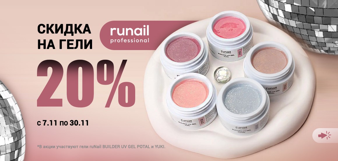 Скидка распространяется только на гели ruNail двух коллекций: Builder UV Gel POTAL и Builder UV Gel YUKI.