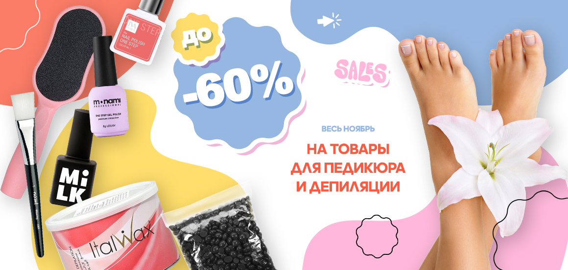 Весь ноябрь скидки до 60% на товары для депиляции, и скидки до 30% на товары для педикюра (гель-лаки и терки).