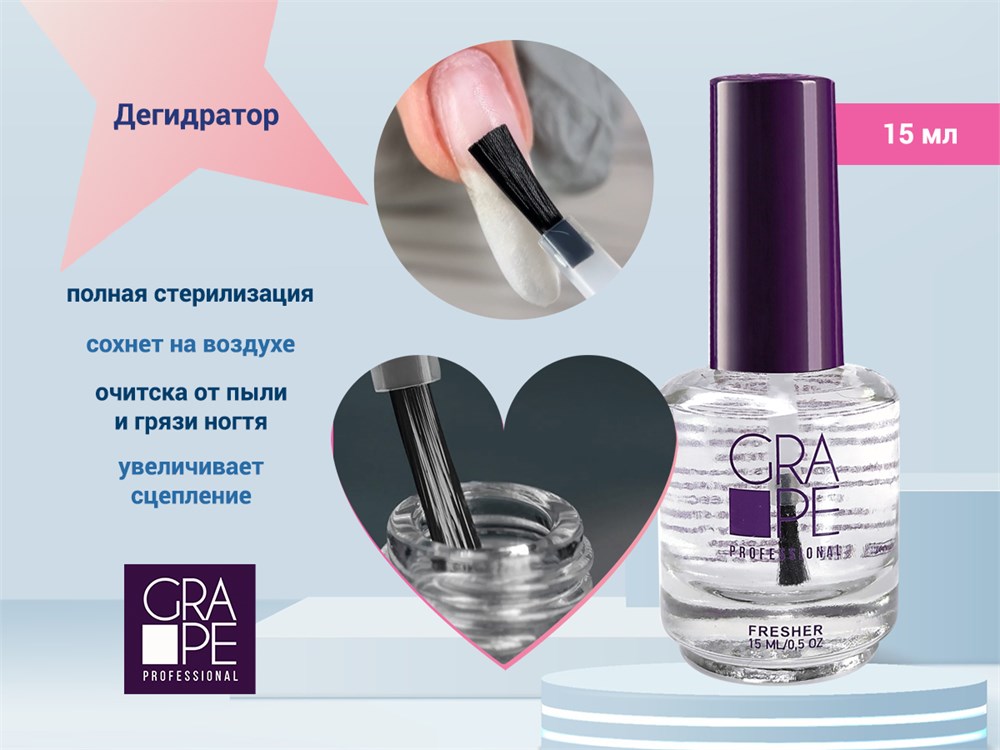 )Подготовительное средство перед нанесением гель лакового покрытия, а также других гелевых систем. Состав выравнивает PH ногтевой пластины , а также способствует обезжириванию и удалению загрязнений с поверхности ногтевой пластины. Играет важную роль в улучшении стойкости и прочности маникюра и педикюра.