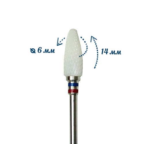 )Керамическая фреза с красной и синей насечками имеет средне-мягкий абразив. Предназначается для снятия искусственных материалов, а также коррекции моделированных ногтей. Форма кукуруза позволяет достаточно легко обрабатывать область около кутикулы и в зоне боковых валиков.