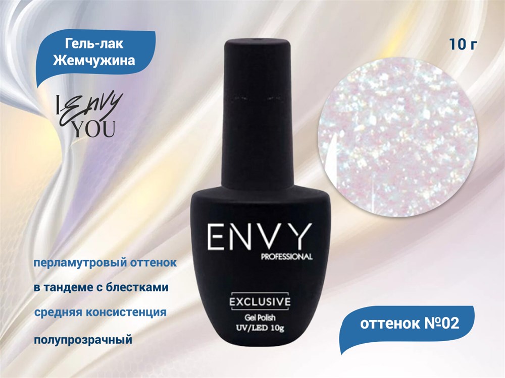 Гель-лак Envy, коллекция «Жемчужина» обладает перламутровым оттенком в тандеме с блестками и мелкими частичками ракушечника. Покрытие придает маникюру эффект драгоценного камня.