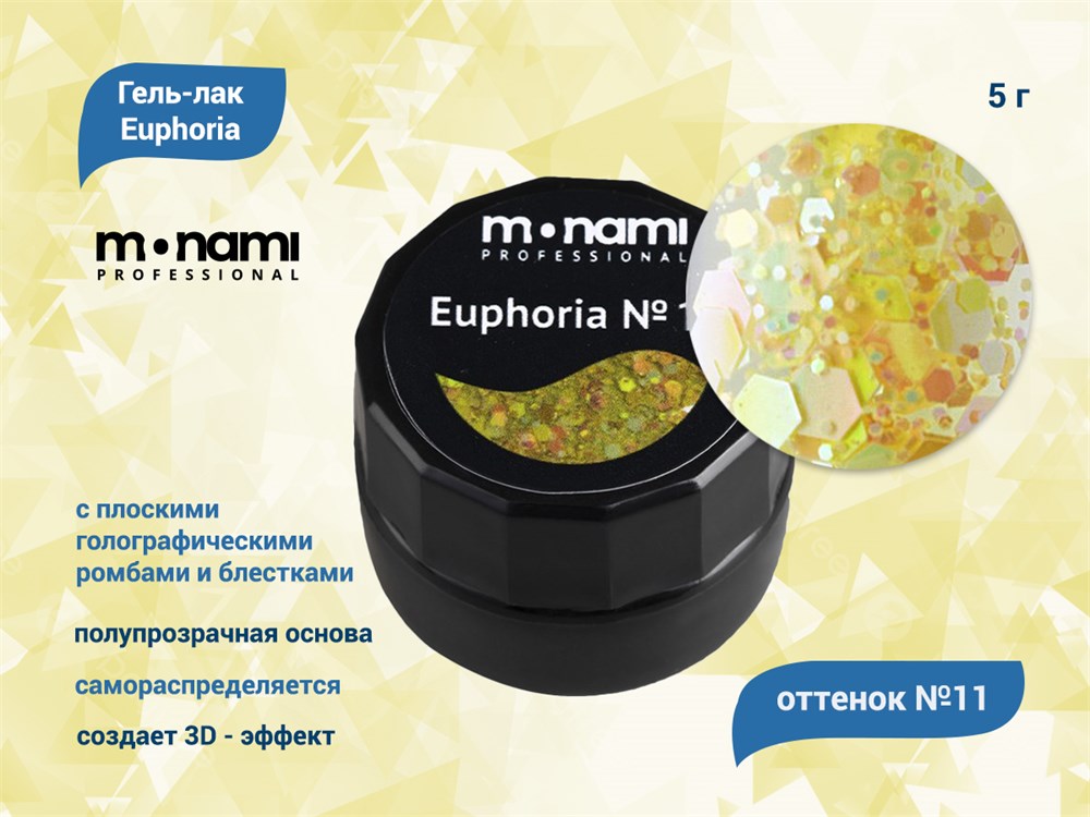 Гель-лак Monami Euphoria c голографическими шестигранниками. Непревзойденное качество покрытия и стойкость вашего маникюра. Эта коллекция ассоциируется с игрой в калейдоскоп: новый угол наклона руки будет создавать новый оттенок маникюра.