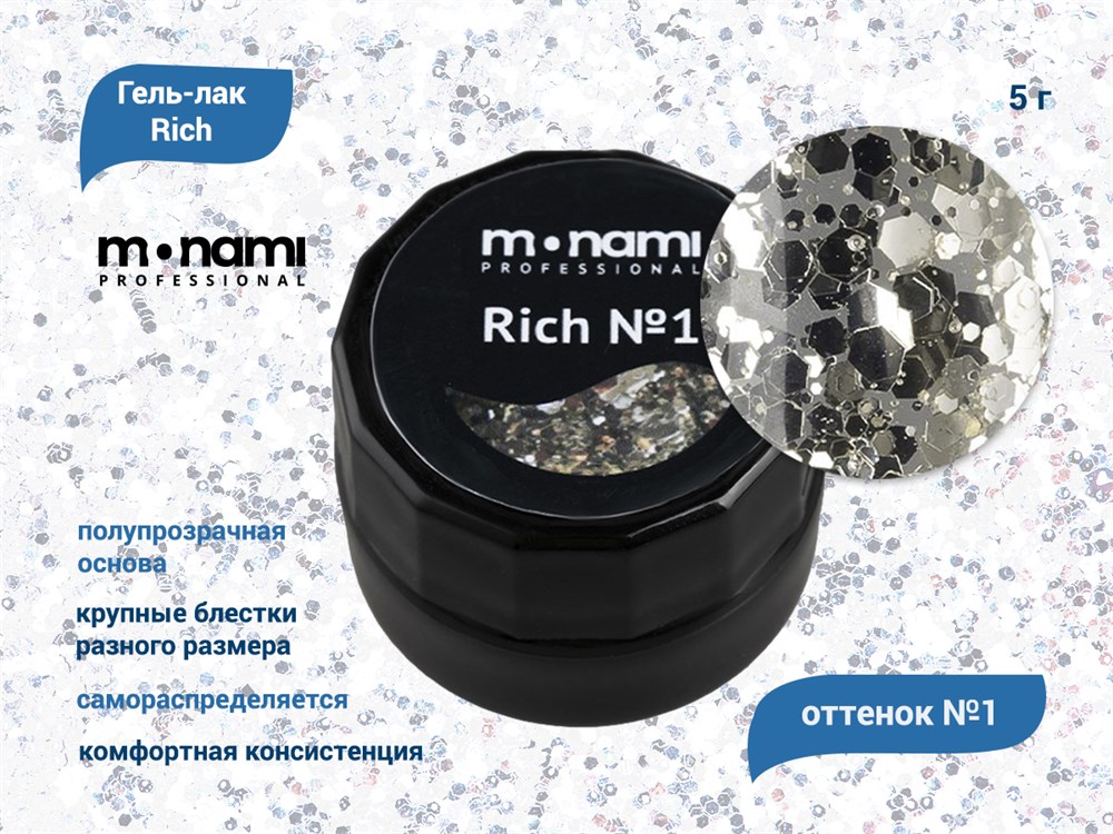 Гель-лак Monami Rich с зеркальными шестигранниками.