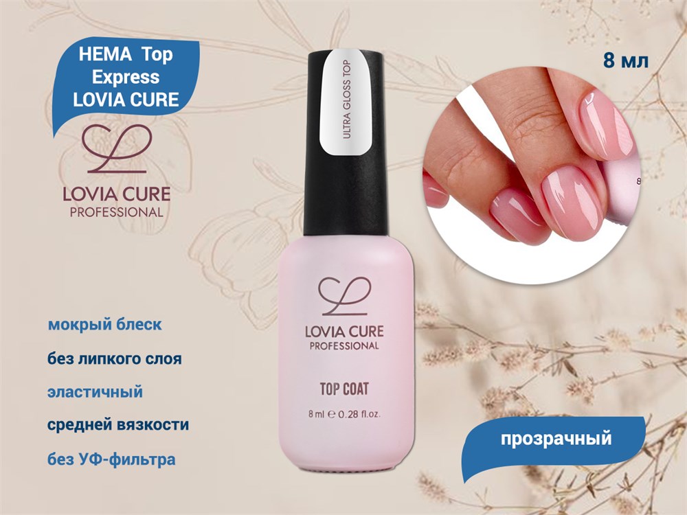 6. Нанесите топовое покрытие Express Hema Free Top Ultra Gloss (время полимеризации в комбинированной лампе 48 Вт не менее 1 минуты).