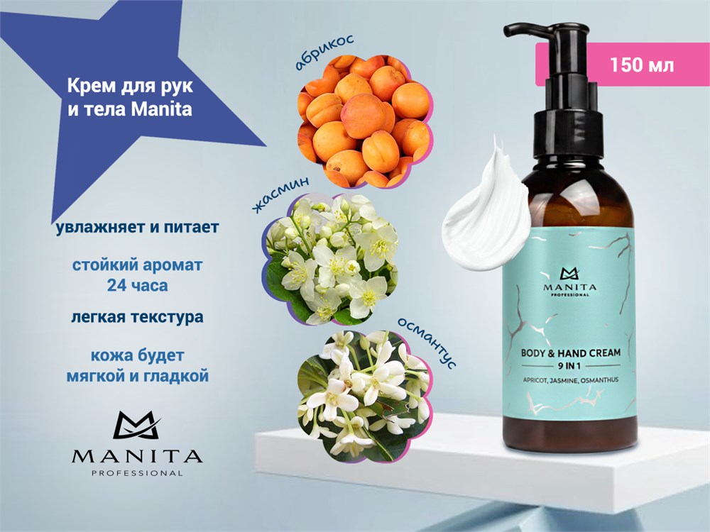 Крем MANITA PROFESSIONAL для рук и тела с ароматами османтуса, розы, жасмина, (150 мл) предлагает уникальное сочетание чувственных и насыщенных нот.