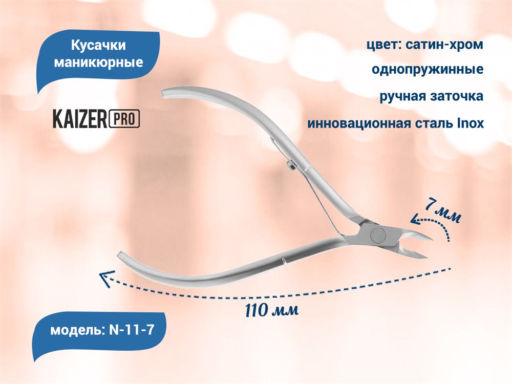)Кусачки маникюрные для кутикулы, металлические, однопружинные, длина 110 мм., полотно 7 мм., цвет САТИН ХРОМ, KAIZER PRO