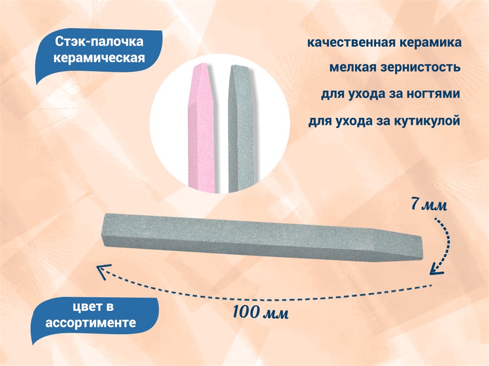 Изготовлена из качественной керамики. Позволяет придать нужную форму ногтевой пластине, а также отодвинуть кутикулу за счет своего скошенного носика.