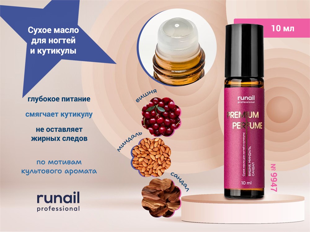 Сухое масло из коллекции PREMIUM PERFUME — это современное профессиональное средство для ухода за кутикулой, сочетающее глубокое питание и утончённый парфюмерный аккорд.