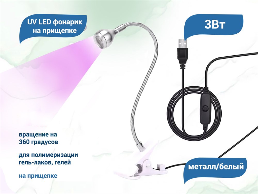 UV LED фонарик на прищепке, usb, цвет металл/белый