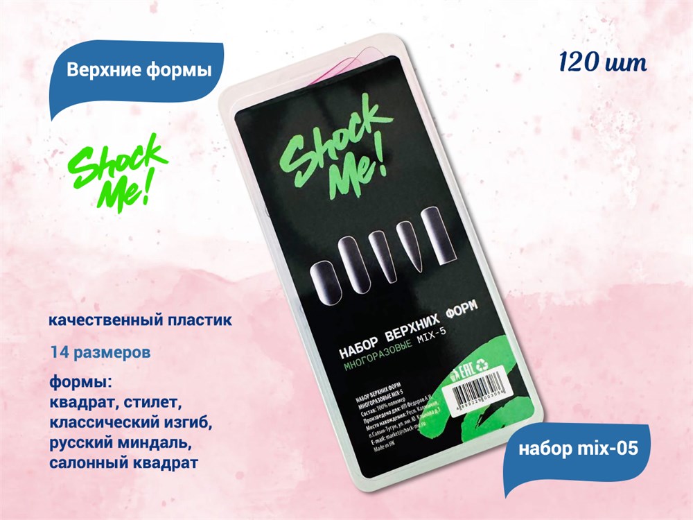 )Верхние формы ShockMe для наращивания ногтей - это правильный выбор тех, кто хочет создать идеальный маникюр без лишних усилий. Они изготовлены из высококачественного пластика и являются износостойкими и прослужат вам долгое время.